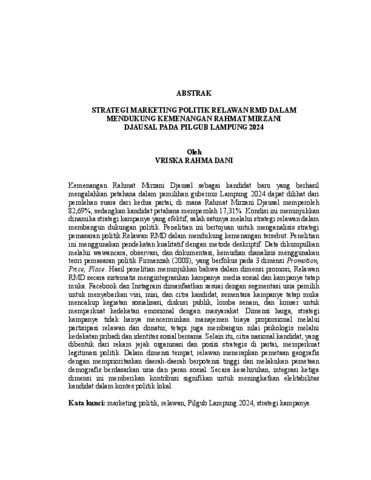 VRISKA, RAHMA DANI (2026) STRATEGI MARKETING POLITIK RELAWAN RMD DALAM MENDUKUNG KEMENANGAN RAHMAT MIRZANI DJAUSAL PADA PILGUB LAMPUNG 2024. FAKULTAS ILMU SOSIAL DAN ILMU POLITIK, UNIVERSITAS LAMPUNG.