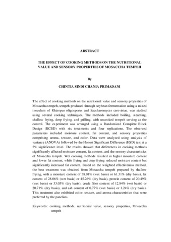 Pengaruh cara pemasakan terhadap nilai gizi dan sifat sensori tempe Mosaccha, yaitu tempe hasil fermentasi kedelai menggunakan inokulum campuran Rhizopus oligosporus dan Saccharomyces cerevisiae, dikaji melalui beberapa metode pemasakan. Metode yang digunakan meliputi perebusan, pengukusan, penggorengan biasa, deep frying, dan pemanggangan, dengan tempe tanpa pemasakan sebagai kontrol. Percobaan disusun menggunakan Rancangan Acak Kelompok Lengkap (RAKL) dengan enam perlakuan dan empat ulangan. Parameter yang diamati meliputi kadar air, kadar lemak, serta sifat sensori yang mencakup aroma, tekstur, dan warna. Data dianalisis menggunakan analisis sidik ragam dan dilanjutkan dengan uji Beda Nyata Jujur (BNJ) pada taraf 5%. Hasil menunjukkan bahwa perbedaan cara pemasakan berpengaruh nyata terhadap kadar air, kadar lemak, dan karakteristik sensori tempe Mosaccha. Pemasakan basah menghasilkan kadar air tinggi dan kadar lemak rendah, sedangkan penggorengan dan deep frying menurunkan kadar air namun meningkatkan kadar lemak secara signifikan. Berdasarkan metode efektivitas pembobotan, perlakuan terbaik diperoleh pada tempe Mosaccha dengan metode penggorengan biasa, dengan kadar air sebesar 38,01% (bb) atau 61,31% (bk), kadar lemak sebesar 28,06% (bb) atau 45,26% (bk), kadar protein 20,49% (bb) atau 33,05% (bk), kadar serat kasar 12,84% (bb) atau 20,71% (bk), dan kadar abu sebesar 0,77% (bb) atau 1,24% (bk), serta memiliki karakteristik warna, tekstur, dan aroma yang disukai panelis. Kata kunci: pemasakan, nilai gizi, sifat sensori, tempe mossacha