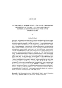 In general, health and biomedical articles have technical and specialized content that makes it difficult for the general public or non-experts to understand and filter information in articles that tend to be long and complex. The increasing number and complexity of biomedical literature, especially in long scientific documents, makes NLP (Natural Language Processing) an important approach in decision making. NLP is capable of making long texts more concise, relevant, and informative through automatic text summarization. In this study, the BioBART model was optimized using the AdamW Optimizer with a fine-tuning process to improve the quality of summaries of long biomedical articles by utilizing the PMC (PubMed Central) dataset, which is known to have a high level of heterogeneity in terms of document length, article structure variation, and terminology complexity. A dataset of 10,000 articles, with 90% for the model and 10% for testing. Of the 9,000 model data, 75% is training data and 25% is validation data. The research process consisted of a preprocessing stage involving text cleaning, normalization, and the application of a sliding window to handle long documents. Then, the BioBART model was fine-tuned by exploring hyperparameters to obtain the best model configuration. Model evaluation was performed using the ROUGE and BERTScore metrics. The results of the study show that the fine-tuned and hyperparameter-optimized BioBART model is capable of producing better and more competitive summaries than the pretrained BioBART model, both lexically and semantically, despite the complexity of long documents and heterogeneity in the PMC dataset. Keywords: PMC, Biomedical Articles, NLP, BioBART Model, AdamW Optimizer, Fine-Tuning, ROUGE, BERTScore, Automatic Text Summarization. Secara umum, artikel kesehatan dan biomedis memiliki konten teknis dan spesialis yang menyebabkan pembaca non-ahli kesulitan memahami dan menyaring informasi dalam artikel yang cenderung panjang dan kompleks. Meningkatnya jumlah dan kompleksitas literatur biomedis, khususnya pada dokumen ilmiah yang panjang (long documents), menjadikan NLP (Natural Language Processing) sebagai pendekatan dalam pengambilan keputusan. NLP mampu menjadikan teks panjang menjadi lebih ringkas, relevan, dan informatif melalui automatic text summarization. Dalam penelitian ini, model BioBART dioptimalkan menggunakan AdamW Optimizer dengan fine-tuning untuk meningkatkan kualitas ringkasan teks artikel biomedis panjang dengan memanfaatkan dataset PMC (PubMed Central) yang dikenal memiliki tingkat heterogenitas tinggi dari sisi panjang dokumen, variasi struktur artikel, dan kompleksitas terminologi. Data sebanyak 10000 artikel, dengan 90% untuk model dan 10% pengujian. Dari 90% data model dibagi menjadi 75% data training dan 25% data validation. Proses penelitian terdiri dari tahap preprocessing yaitu pembersihan teks, normalisasi, serta penerapan sliding window untuk menangani dokumen panjang. Kemudian proses fine-tuning model BioBART dengan eksplorasi hyperparameter untuk memperoleh konfigurasi model terbaik. Evaluasi model dilakukan menggunakan metrik ROUGE dan BERTScore. Hasil penelitian menunjukkan bahwa model BioBART hasil fine-tuning dan optimalisasi hyperparameter mampu menghasilkan ringkasan yang lebih baik dan kompetitif dibandingkan model BioBART pretrained, baik secara leksikal maupun semantik, meskipun dihadapkan pada kompleksitas dokumen panjang dan heterogenitas pada dataset PMC. Kata-kata kunci: PMC, Artikel Biomedis, NLP, Model BioBART, AdamW Optimizer, Fine-Tuning, ROUGE, BERTScore, Automatic Text Summarization.