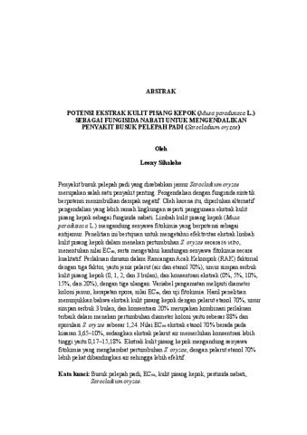 LEONY, SIHALOHO (2026) POTENSI EKSTRAK KULIT PISANG KEPOK (Musa paradisiaca L.) SEBAGAI FUNGISIDA NABATI UNTUK MENGENDALIKAN PENYAKIT BUSUK PELEPAH PADI (Sarocladium oryzae). FAKULTAS PERTANIAN, UNIVERSITAS LAMPUNG.