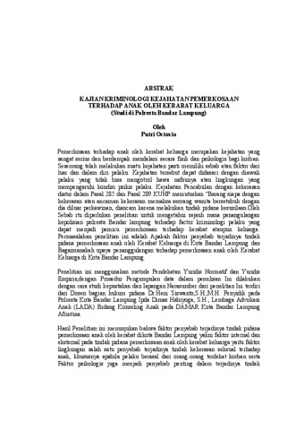 Pemerkosaan terhadap anak oleh kerabat keluarga merupakan kejahatan yang sangat serius dan berdampak mendalam secara fisik dan psikologis bagi korban. Seseorang telah melakukan suatu kejahatan pasti memiliki sebab atau faktor dari luar dan dalam diri pelaku. Kejahatan tersebut dapat didasari dengan diawali pelaku yang tidak bisa mengotrol hawa nafsunya atau lingkungan yang mempengaruhi kondisi psikis pelaku. Kejahatan Pencabulan dengan kekerasan diatur dalam Pasal 285 dan Pasal 289 KUHP memutuskan “Barang siapa dengan kekerasan atau ancaman kekerasan memaksa seorang wanita bersetubuh dengan dia diluar perkawinan, diancam karena melakukan tindak pidana kesusilaan.Oleh Sebab itu diperlukan penelitian untuk mengetahui sejauh mana penangulangan kepolisian polresta Bandar lampung terhadap factor kriminologi pelaku yang dapat menjadi pemicu pemerkosaan terhadap kerabat ataupun keluarga. Permasalahan penelitian ini adalah Apakah faktor penyebab terjadinya tindak pidana pemerkosaan anak oleh Kerabat Keluarga di Kota Bandar Lampung dan Bagaimanakah upaya penanggulangan terhadap pemerkosaan anak oleh Kerabat Keluarga di Kota Bandar Lampung. Penelitian ini menggunakan metode Pendekatan Yuridis Normatif dan Yuridis Empiris,dengan Prosedur Pengumpulan data dalam penulisan Ini dilakukan dengan cara studi kepustakan dan lapangan.Narasumber dari penelitian Ini terdiri dari Dosen bagian hukum pidana Dr.Heni Siswanto,S.H.,M.H. Penyidik pada Polresta Kota Bandar Lampung Ipda Dimas Habiyoga, S.H., Lembaga Advokasi Anak (LADA) Bidang Konseling Anak pada DAMAR Kota Bandar Lampung Afrintina. Hasil Penelitian ini menunjukan bahwa faktor penyebab terjadinya tindak pidana pemerkosaan anak oleh kerabat dikota Bandar Lampung yakni faktor internal dan eksternal pada tindak pidana pemerkosaan anak oleh kerabat keluarga yaitu faktor lingkungan salah satu penyebab terjadinya tindak kekerasan seksual terhadap anak, khususnya apabila pelaku berasal dari orang-orang terdekat korban serta Faktor psikologis juga menjadi penyebab penting dalam terjadinya tindakPutri Octavia kekerasan seksual terhadap anak. Pelaku sering kali memiliki gangguan kepribadian, kontrol diri yang lemah, atau penyimpangan seksual yang mendorong munculnya hasrat seksual terhadap anakFaktor psikologis juga menjadi penyebab penting dalam terjadinya tindak kekerasan seksual terhadap anak. Pelaku sering kali memiliki gangguan kepribadian, kontrol diri yang lemah, atau penyimpangan seksual yang mendorong munculnya hasrat seksual terhadap anakFaktor psikologis juga menjadi penyebab penting dalam terjadinya tindak kekerasan seksual terhadap anak. Pelaku sering kali memiliki gangguan kepribadian, kontrol diri yang lemah, atau penyimpangan seksual yang mendorong munculnya hasrat seksual terhadap anak, Upaya Penanggulangan Terhadap Pemerkosaan Anak Oleh Kerabat Keluarga Di Kota Bandar Lampung dilakukan dengan cara 1) Memberikan Sosialisasi Secara Rutin Tentang Kekerasan Seksual Terhadap Anak ,2) Pengembangan Keterampilan Masyarakat untuk Melaporkan Kasus Kekerasan Seksual. 3) Upaya Represif Melalui Penegakan Hukum Yang Tegas Dan Efektif Upaya represif melalui penegakan hukum yang tegas dan efektif merupakan langkah penting dalam menanggulangi tindak pidana pemerkosaan terhadap anak. Saran dalam penelitian ini Kepolisian dan Kejaksaan, diharapkan lebih mengoptimalkan upaya penanggulangan tindak pidana pemerkosaan anak oleh kerabat keluarga melalui pendekatan penal dan non-penal secara terpadu. Penegakan hukum harus dilakukan secara tegas terhadap pelaku guna memberikan efek jera, disertai dengan upaya preventif melalui penyuluhan hukum, pengawasan lingkungan keluarga, serta pembatasan akses terhadap pornografi yang terbukti menjadi salah satu faktor pendorong terjadinya kejahatan seksual terhadap anak. Selain itu, koordinasi antarinstansi dan lembaga perlindungan anak perlu diperkuat agar penanganan perkara berjalan efektif dan berpihak pada perlindungan korban. Kata Kunci: Kriminologi; Pemerkosaan; Anak;