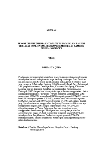 Briliant , Aqsho (2026) PENGARUH SUPLEMENTASI COMPLETE PREMIX DALAM RANSUM TERHADAP KUALITAS MAKROSKOPIS SEMEN SEGAR KAMBING PERSILANGAN BOER. FAKULTAS PERTANIAN, UNIVERSITAS LAMPUNG.