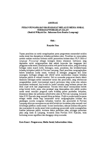 Tujuan penelitian ini untuk mengekspolasi peran pengawasan masyarakat melalui media sosial dan dampaknya terhadap perbaikan jalan. Penelitian ini menerapkan metode analisis sentimen berbasis model pemrosesan bahasa alami NLP (Natural Language Processing) sebagai kerangka desain utamanya. Instrumen yang digunakan untuk mengumpulkan data adalah komentar dan tanggapan dari pengguna media sosial, khususnya melalui web portal berita online, yang mencakup berbagai reaksi seperti kritik, dukungan, saran, penolakan, dan ketidaksetujuan terhadap kebijakan publik di Provinsi Lampung. Hasil penelitian mengungkapkan bahwa kehadiran media sosial, terutama di kalangan pengguna dari kelas menengah, berfungsi sebagai alat efektif untuk memberikan respons terhadap kebijakan publik di wilayah tersebut. Hal ini menandai pergeseran drastis dalam dinamika hubungan antara masyarakat umum dan pemerintah, yang sebelumnya mengandalkan model konvensional seperti pertemuan tatap muka atau saluran komunikasi tradisional, kini beralih ke model interaksi yang berbasis internet dan lebih cepat serta luas jangkauannya. Temuan lebih lanjut menunjukkan bahwa setiap bentuk kritik, saran, atau pendapat yang disampaikan oleh publik melalui media sosial memiliki pengaruh nyata terhadap proses perubahan kebijakan, khususnya dalam hal perbaikan infrastruktur jalan di Provinsi Lampung, termasuk Jalan H.M. Ryacudu yang menjadi fokus perhatian. Platform media sosial berperan sebagai wadah utama bagi masyarakat untuk mengungkapkan keluhan dan pandangan mereka mengenai kebijakan tersebut, dan pemerintah di Provinsi Lampung akhirnya merespons secara aktif setelah isu kerusakan jalan menjadi viral di berbagai platform media sosial. Secara keseluruhan, adanya kritikan atau protes dari masyarakat di media sosial telah mendorong pemerintah untuk meningkatkan kualitas pelayanan publik, terutama dalam perbaikan jalan, sehingga persentase jalan yang rusak di Lampung, termasuk Jalan Provinsi H.M. Ryacudu, telah berkurang secara signifikan dan dianggap cukup memadai. Kata Kunci : Pengawasan, Media Sosial, Infrastruktur Jalan. The aim of this research is to explore the role of public oversight through social media and its impact on road repairs. In its approach, this research applies a sentiment analysis method based on the Natural Language Processing (NLP) model as its main design framework. The instrument used to collect data is comments and responses from social media users, especially through online news portals, which include various reactions such as criticism, support, suggestions, rejection, and disagreement towards public policies in Lampung Province. The research results reveal that the presence of social media, especially among middle-class users, functions as an effective tool to respond to public policies in the region. This marks a drastic shift in the dynamics of the relationship between the general public and the government, which previously relied on conventional models such as face-toface meetings or traditional communication channels, now shifting to an internetbased interaction model that is faster and has wider reach. Further findings show that every form of criticism, suggestion, or opinion expressed by the public through social media has a real influence on the policy change process, especially in terms of road infrastructure improvement in Lampung Province, including H.M. Ryacudu Road which is the focus of attention. Social media platforms serve as the main venue for the public to express their complaints and views regarding the policy, and the government in Lampung Province finally responds actively after the road damage issue goes viral on various social media platforms. Overall, the presence of criticism or protests from the community on social media has encouraged the government to improve the quality of public services, especially in road repairs, so that the percentage of damaged roads in Lampung, including Provincial Road H.M. Ryacudu, has decreased significantly and is considered adequate. Keywords : Surveillance, Social Media, Road Infrastructur