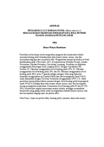 Dimas Wahyu , Mardianto (2026) PENGARUH BLEND BAWANG PUTIH (Allium sativum L) SEBAGAI BAHAN MARINASI TERHADAP DAYA SUKA SENSORI DAGING AYAM RAS PETELUR AFKIR. FAKULTAS PERTANIAN, UNIVERSITAS LAMPUNG.