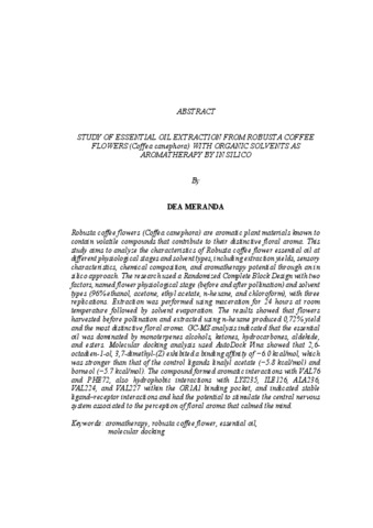 DEA , MERANDA (2026) KAJIAN EKSTRAKSI MINYAK ESENSIAL BUNGA KOPI ROBUSTA (Coffea canephora) DENGAN PELARUT ORGANIK SEBAGAI AROMATERAPI SECARA IN SILICO. FAKULTAS PERTANIAN, UNIVERSITAS LAMPUNG.