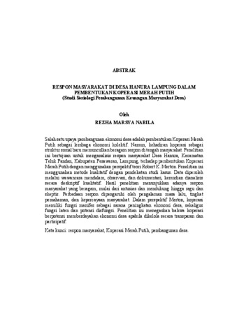 Salah satu upaya pembangunan ekonomi desa adalah pembentukan Koperasi Merah Putih sebagai lembaga ekonomi kolektif. Namun, kehadiran koperasi sebagai struktur sosial baru memunculkan beragam respon di tengah masyarakat. Penelitian ini bertujuan untuk menganalisis respon masyarakat Desa Hanura, Kecamatan Teluk Pandan, Kabupaten Pesawaran, Lampung, terhadap pembentukan Koperasi Merah Putih dengan menggunakan perspektif teori Robert K. Merton. Penelitian ini menggunakan metode kualitatif dengan pendekatan studi kasus. Data diperoleh melalui wawancara mendalam, observasi, dan dokumentasi, kemudian dianalisis secara deskriptif kualitatif. Hasil penelitian menunjukkan adanya respon masyarakat yang beragam, mulai dari antusias dan mendukung hingga ragu dan skeptis. Perbedaan respon dipengaruhi oleh pengalaman masa lalu, tingkat pemahaman, dan kepercayaan masyarakat. Dalam perspektif Merton, koperasi memiliki fungsi manifes sebagai sarana peningkatan ekonomi desa, sekaligus fungsi laten dan potensi disfungsi. Penelitian ini menegaskan bahwa koperasi berpotensi memberdayakan ekonomi desa apabila dikelola secara transparan dan partisipatif. Kata kunci: respon masyarakat, Koperasi Merah Putih, pembangunan desa. One effort to promote the rural economy is the establishment of the Koperasi Merah Putih as a collective economic institution. However, as a new social structure, the cooperative has generated diverse community responses. This study analyzes community responses in Hanura Village, Teluk Pandan Sub-district, Pesawaran Regency, Lampung, to the establishment of the Koperasi Merah Putih using Robert K. Merton’s theoretical perspective. This research employs a qualitative case study approach. Data were collected through in-depth interviews, observation, and documentation and analyzed descriptively. The findings indicate varied community responses, ranging from supportive to skeptical attitudes. These differences are influenced by past experiences, levels of understanding, and public trust. From a Mertonian perspective, the cooperative serves a manifest economic function while also generating latent functions and potential dysfunctions. The study concludes that the cooperative can empower the rural economy if managed transparently and participatively. Keywords: community response, Koperasi Merah Putih, rural development.
