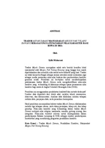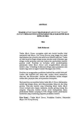Teradisei Miyah Damau ngerupaken salah sai bentuk kearipan lokal masarakat adat Megou Pak Tulang Bawang sai sepai tanou pagun dipertahanken sertou ngemek nilai sosial jamou edukatip sai kuat. Teradisei ejou mak moneh bepungsei sebagai sarana interaksei sosial ngelainken moneh sebagai media pewarisan nilai-nilai budayou jamou pembentukan karakter generasei modou. Penelitiyan ejou betujuan guai ngedeskripseiken pelaksanaan tradisei Miyah Damau sertou ngonot nilainilai karakter sai terkandung di dilemnou sebagai upayou penanaman nilai karakter bagei siswa di tingkat Sekolah Menengah Atas (SMA). Penelitian ejou ngegonouken pendekatan kualitatip jamou metode deskriptif. Sumber data mesou jak tokoh adat, ngegonouken teknik wawancara, obserpasei, jamou dokumentasei. Analisis data dilakuken jak peperou tahapan diantarounou reduksi data, penyajian data, sertou penarikan kesimpulan. Hasil penelitian ngenyulukken bahwa teradisei Miyah Damau dilaksanaken ngelalui tegou tahap utamou, sai pertamou tahap persiapan, keduou tahap inti, jamou sai terakhir tahap penutup. Nilai-nilai karakter sai tekandung dilem teradisei Miyah Damau ngeliputei nilai religius, nasionalis, mandirei, gotong royong, jamou integritas. Nilai-nilai tersebut relepan guai diintegrasiken dilem pembelajaran Bahasa Lampung di SMA sebagai sumber pembelajaran kontekstual sai ngedukung penguatan pendidikan karakter. Kata Kunci : Teradisei Miyah Damau, Pendidikan Karakter, Masarakat Megou Pak Tulang Bawang.