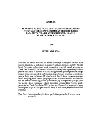 SHERLI, MARSELA (2026) PENGARUH MODEL THINK PAIR SHARE (TPS) BERBANTUAN WORDWALL TERHADAP KEMAMPUAN BERPIKIR KRITIS PADA MATA PELAJARAN PENDIDIKAN PANCASILA PESERTA DIDIK KELAS V SD. FAKULTAS KEGURUAN DAN ILMU PENDIDIKAN, UNIVERSITAS LAMPUNG.