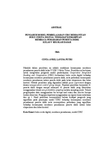 Cinta, Avril Lavina Putri (2026) PENGARUH MODEL PEMBELAJARAN CIRC BERBANTUAN BUKU CERITA DIGITAL TERHADAP KEMAMPUAN MEMBACA PEMAHAMAN PESERTA DIDIK KELAS V SEKOLAH DASAR. FAKULTAS KEGURUAN DAN ILMU PENDIDIKAN, UNIVERSITAS LAMPUNG.
