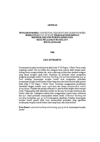 LIZA, AYUMARETA (2026) PENGARUH MODEL CONTEXTUAL TEACHING AND LEARNING (CTL) BERBANTUAN POP UP BOOK TERHADAP KEMAMPUAN BERPIKIR KREATIF PESERTA DIDIK PADA MATA PELAJARAN IPA KELAS V SEKOLAH DASAR. FAKULTAS KEGURUAN DAN ILMU PENDIDIKAN, UNIVERSITAS LAMPUNG.