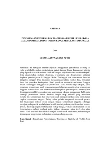 Penelitian ini bertujuan mendeskripsikan penggunaan pendekatan teaching at right level (TaRL) dalam pembelajaran tari di Sanggar Bulan Temanggal. Metode yang digunakan adalah metode kualitatif dengan penjabaran data secara deskriptif. Data dikumpulkan melalui observasi, wawancara, dan dokumentasi terhadap kegiatan pembelajaran di Sanggar Bulan Temanggal dan wawancara bersama pengelola sanggar. Data dianalisis menggunakan teknik reduksi data, penyajian data, dan penarikan kesimpulan. Hasil penelitian menunjukkan bahwa Sanggar Bulan Temanggal menggunakan pendekatan TaRL melalui tiga tahapan, yaitu pemetaan kemampuan awal, penyusunan pembelajaran sesuai tingkat kemampuan anggota, serta evaluasi dan refleksi terhadap kegiatan pembelajaran. Pembelajaran di sanggar memiliki kesesuaian yang kuat dengan tahapan penggunaan TaRL pada lembaga pendidikan formal ditandai dengan.tahap pertama yang dilakukan melalui tes kemampuan dan observasi untuk mengidentifikasi serta memetakan tingkat kemampuan anggota. Tahap kedua, pelatih menyesuaikan materi, proses, dan lingkungan latihan sesuai dengan tingkat kemampuan anggota, sehingga merujuk pada praktik pembelajaran berdiferensiasi pada aspek diferensiasi konten, proses, dan lingkungan pembelajaran. Tahap ketiga, evaluasi dilaksanakan secara berkelanjutan melalui evaluasi rutin, latihan gabungan, ujian kecil, dan ujian besar. Hasil evaluasi dan refleksi menjadi dasar untuk memantau perkembangan kemampuan anggota dan melakukan pemetaan ulang anggota. Kata Kunci : Pendekatan Pembelajaran, Teaching at Right Level (TaRL), Seni Tari. This study aims to describe the implementation of the Teaching at the Right Level (TaRL) approach in dance learning at Sanggar Bulan Temanggal. The study employs a qualitative method with a descriptive approach to data analysis. Data were collected through observation, interviews, and documentation of learning activities at Sanggar Bulan Temanggal, as well as interviews with the studio manager. The data were analyzed using data reduction, data display, and conclusion drawing techniques. The results of the study indicate that Sanggar Bulan Temanggal implements the TaRL approach through three stages: initial ability mapping, the design of learning activities based on participants’ ability levels, and evaluation and reflection on the learning process. The learning practices in the studio show strong alignment with the theoretical stages of TaRL implementation. The first stage is conducted through ability tests and observations to identify and map the participants’ levels of competence. In the second stage, instructors adjust the content, learning process, and training environment according to the participants’ ability levels, reflecting differentiated learning practices in terms of content, process, and learning environment. The third stage involves continuous evaluation through regular assessments, joint practice sessions, minor tests, and major examinations. The results of evaluation and reflection serve as a basis for monitoring participants’ progress and for remapping their ability levels. Keywords: Learning Approach, Teaching at the Right Level (TaRL), Dance Art.